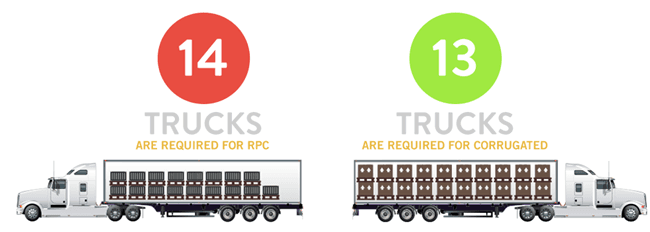 Because corrugated containers are lighter than plastic, you can ship as many as two or three additional pallets of product in every truckload. A load that would take 14 truckloads to ship in RPCs could be shipped in only 13 trucks using corrugated packaging.