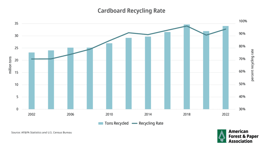 The AF&PA’s 2021 Access to Recycling Study found 94% of Americans have access to community recycling programs that include OCC – boxes used for everything from shipping boxes to pizza boxes.