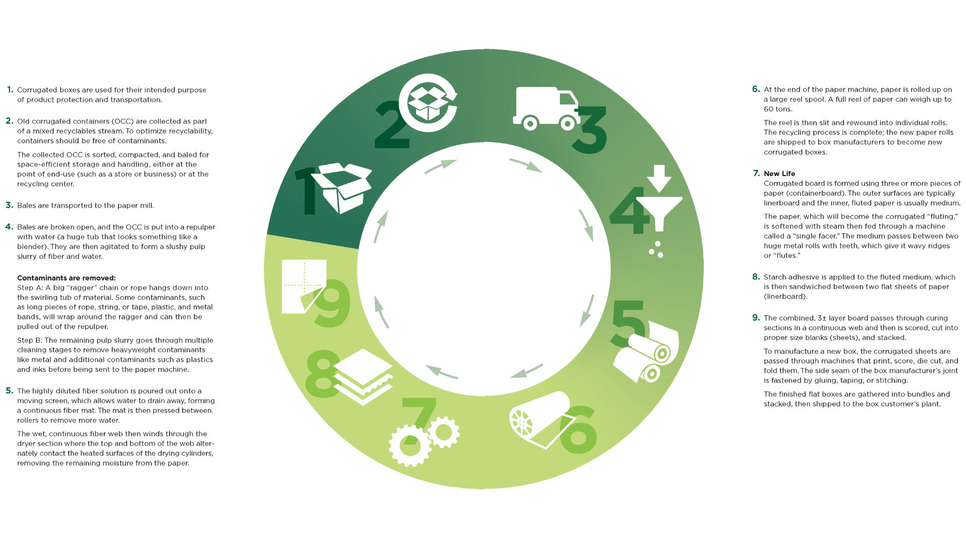 Businesses, retailers and consumers at home collect and return their used corrugated containers to be recycled into new ones. While almost everyone contributes to corrugated’s recycling success, fewer people may know where those boxes go from the collection point, or how they are processed to produce new corrugated material. Here’s how corrugated is recycled: